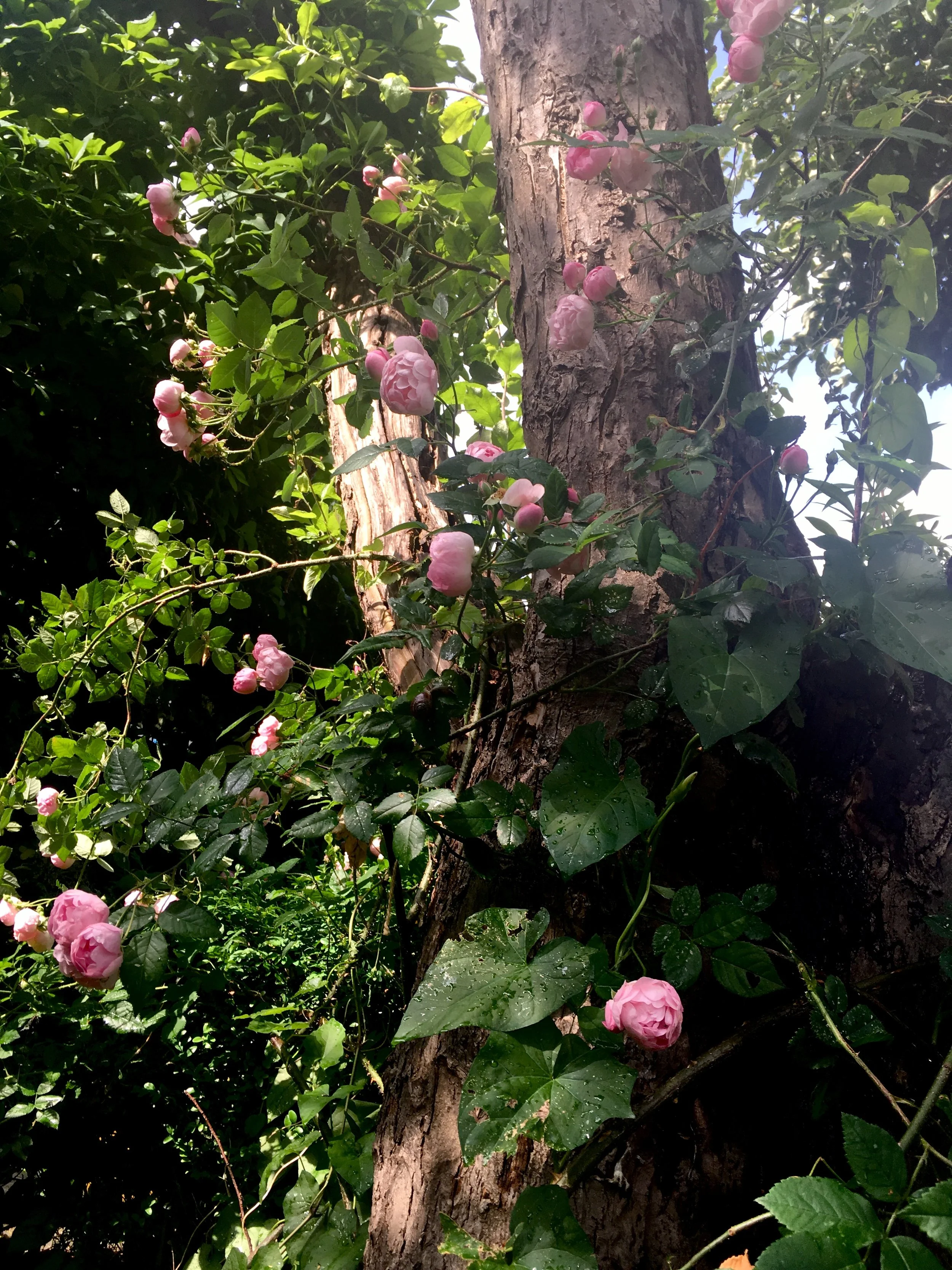 På tysk er raubritter betegnelsen for en skruppelløs feudal herremand, som opkrævede uretfærdigt høje skatter selv for sin tid. Måske betyder det også noget andet, for hvorfor man ellers skulle finde på at opkalde en romantisk lyserød rose efter sådan en fyr, kan jeg ikke lige greje. Rosen ‘Raubritter’ har masser af små runde lidt løse roser, som hos mig vokser op i et gammelt, frønnet æbletræ og passer lige til det.